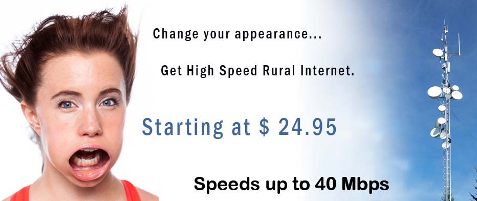 If you live in a rural area and are tired of slow Internet try our High Speed Wireless Internet with speeds up to 40 Mbps. Our service completely eliminates the telephone company. With speeds up to 40 Mbps you can work from home with a VPN connection, watch movies on Netflix or other video service, connect to gaming servers, use a VoIP phone to reduce you monthly phone bill, or simply browse the web without having to wait for slow loading pages.